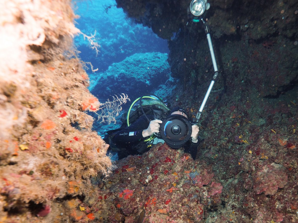 Dann geht’s aber zurück und ab in die Höhle: Dort tummeln sich oft Fischschwärme im Eingangsbereich. Ist man einige Meter in die Höhle hineingetaucht, dann auf jeden Fall nochmal einen Blick zurück werfen, ein wunderbares Farbspiel, wenn man ins offene Blau schaut!