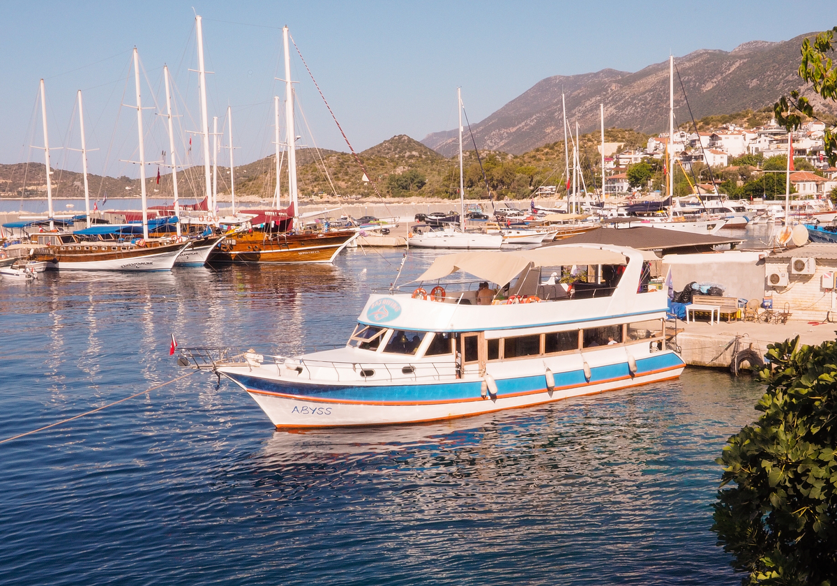 Über zwei stattliche Boote verfügt Kas Diving mittlerweile, eines mit eigenem Kompressor. Beide sind zweckmäßig ausgestattet mit Süßwasserduschen und ausreichend Platz und Stauraum für die Dinge, die nicht nass werden sollen.